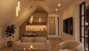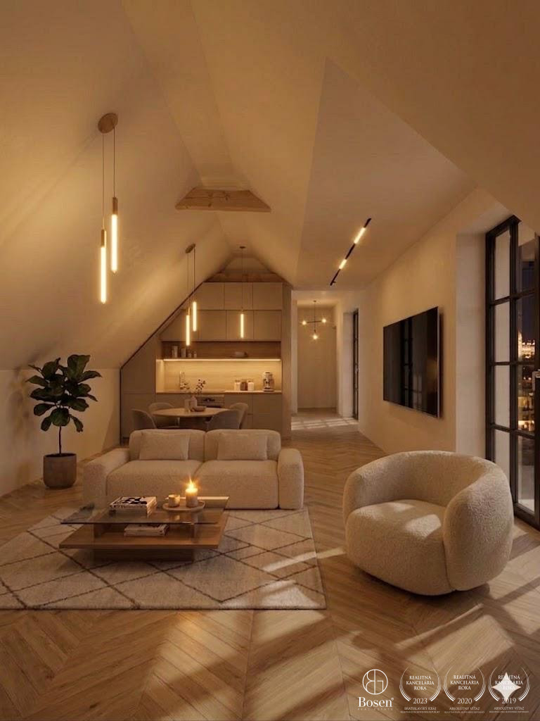 Pri vstupe do bytu sa nachádza zádverie a spojená kúpeľňa s WC. Oproti vstupu je priestranný šatník a ďalej sa dostávame do priestoru spojenej obývačky s kuchyňou o rozlohe 34 m² s výstupom na balkón o rozlohe 6 m². Izby majú juhozápadnú orientáciu a z každej izby je prístup na spoločný balkón. Byt je autentický priznanými stropnými prvkami krovu v spoločenskej časti kuchyne s obývačkou.
