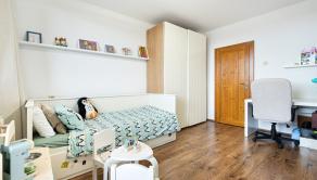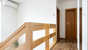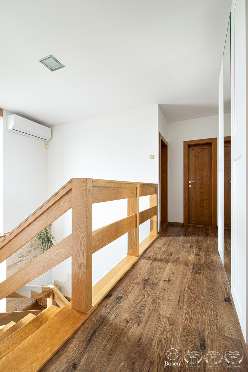 Na poschodí sú tri samostatné spálne, kúpeľňa s vaňou, práčkou a sušičkou a samostatné WC. Z dvoch izieb je výstup na priestranný balkón orientovaný smerom na ulicu.