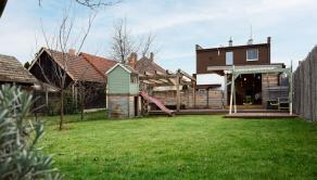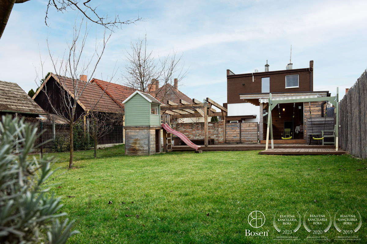 Záhrada je pekne upravená, nachádzajú sa tu ovocné stromy a trávnatá plocha vhodná na oddych aj aktívne využitie.