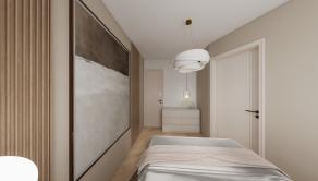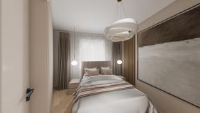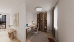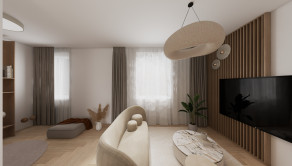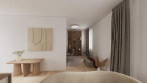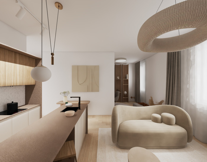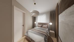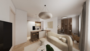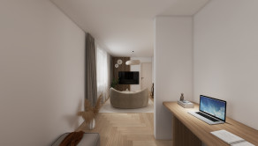 DISPOZÍCIA: Priestranná vstupná chodba, komora, kúpeľňa so sprchovým kútom a toaletou, obývacia časť prepojená s kuchyňou a pracovným kútom (s možnosťou úpravy na samostatnú izbu), samostatná spálňa s walk-in šatníkom.