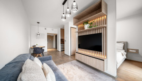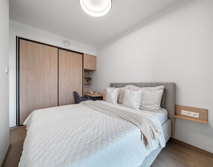 ZARIADENIE: Byt sa prenajíma kompletne zariadený kvalitným nábytkom. Vo vstupnej chodbe sa nachádza vstavaná skriňa. Kuchyňa je vybavená vstavanou kuchynskou linkou so spotrebičmi, ako sú umývačka riadu, indukčná varná doska, elektrická rúra, chladnička s mrazničkou a mikrovlnná rúra. Súčasťou zariadenia je aj jedálenský stôl so stoličkami. Obývacia časť je vybavená rozkladacím gaučom, TV zostavou a televízorom. V kúpeľni sa nachádza práčka, skrinka pod umývadlom, zrkadlo a vaňa. Spálňa je zariadená manželskou posteľou, vstavanou skriňou a pracovným kútom so stoličkou.
