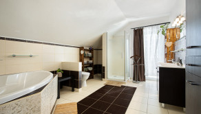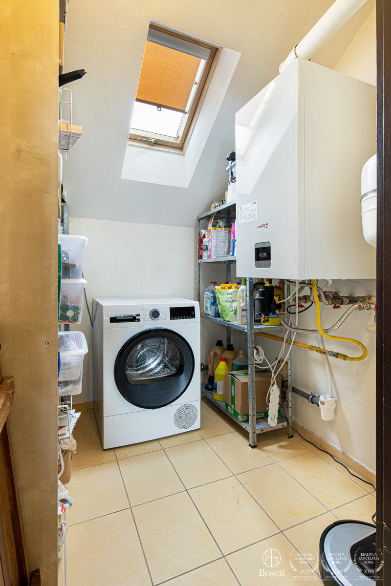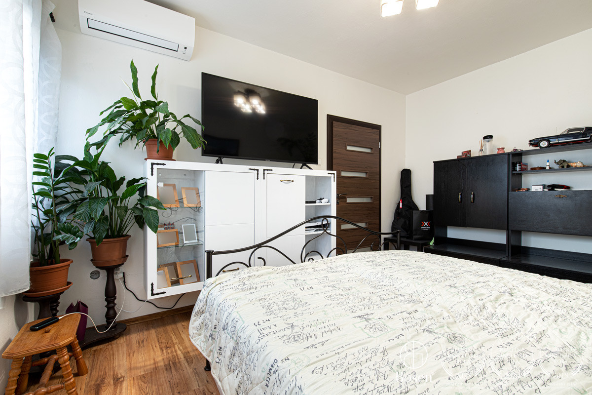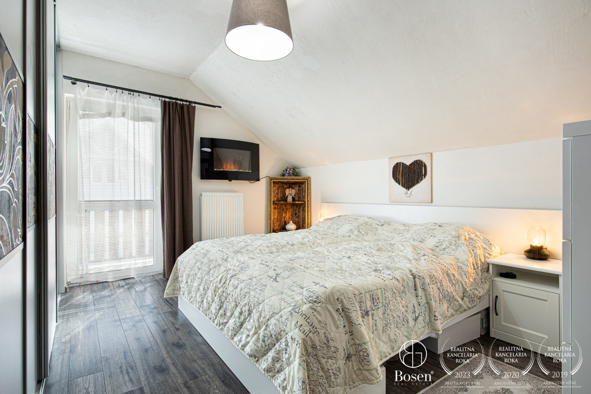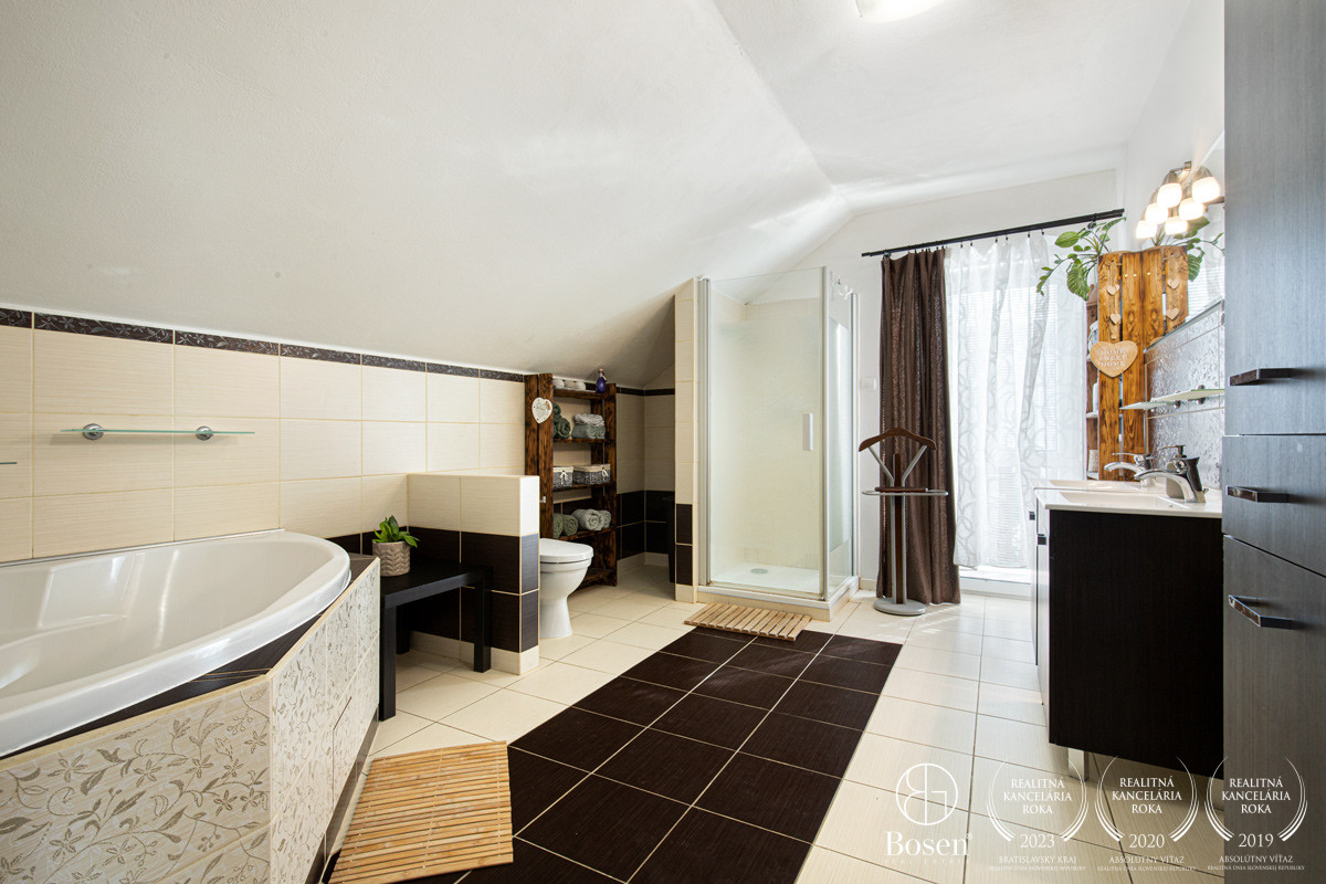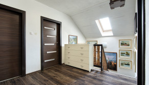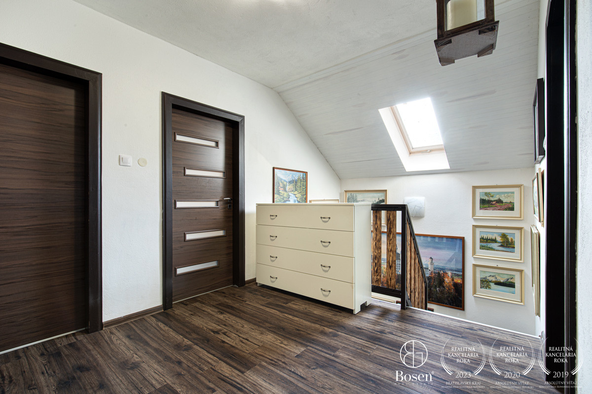 Na poschodí je priestranná chodba, priestranná kúpeľňa veľkosti izby, samostatná toaleta a tri klimatizované spálne. Technická miestnosť disponuje novým kondenzačným plynovým kotlom. Balkón s výmerou 15 m² prepája jednu zo spální s kúpeľňou.