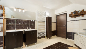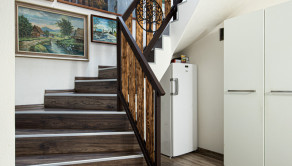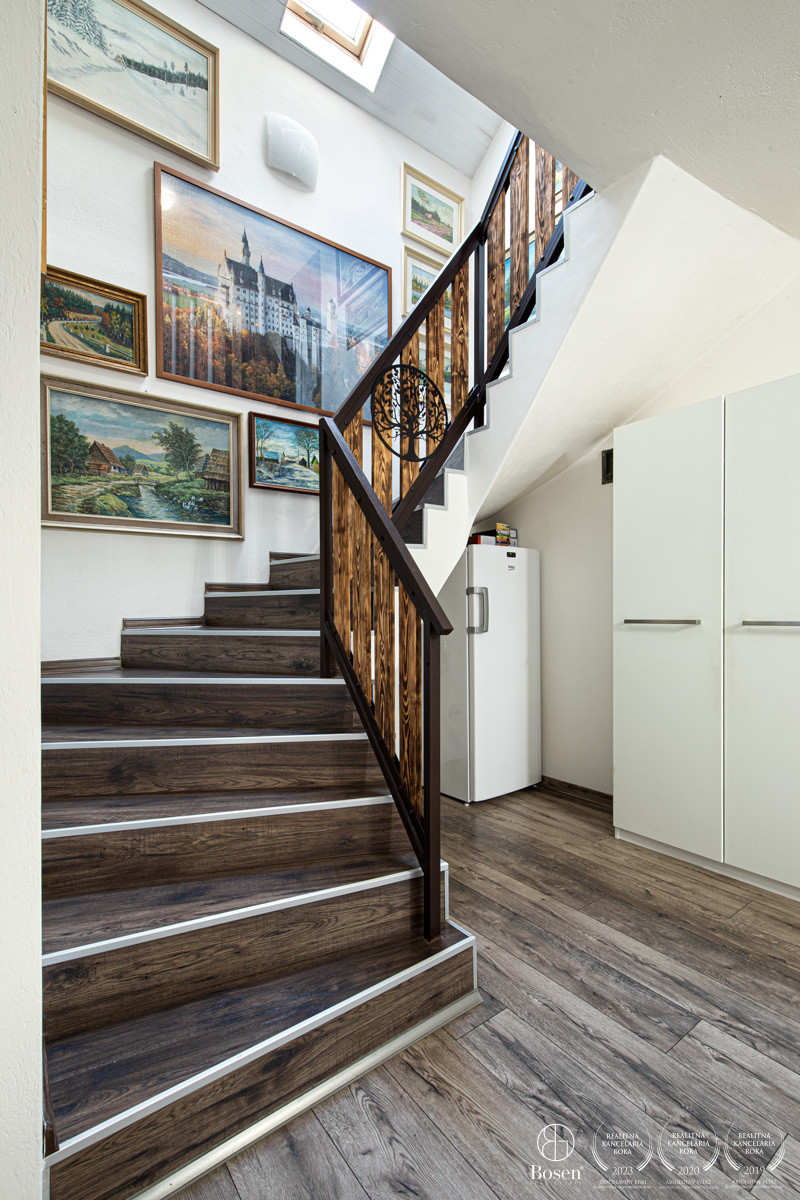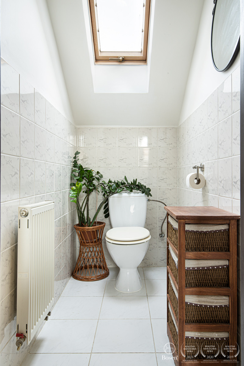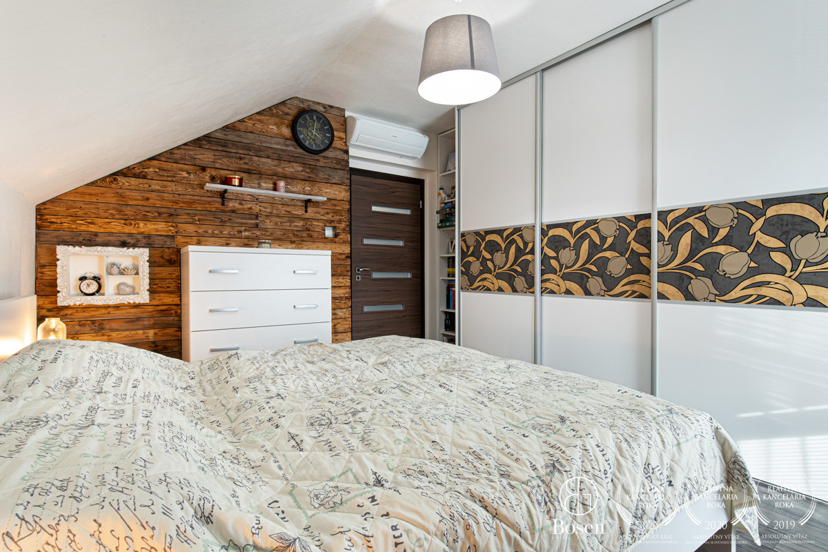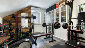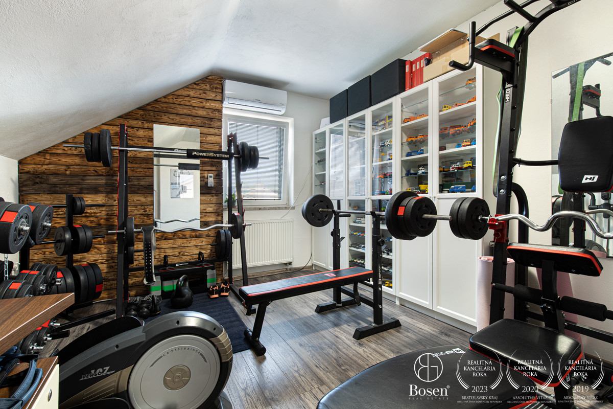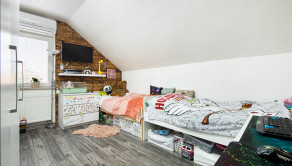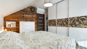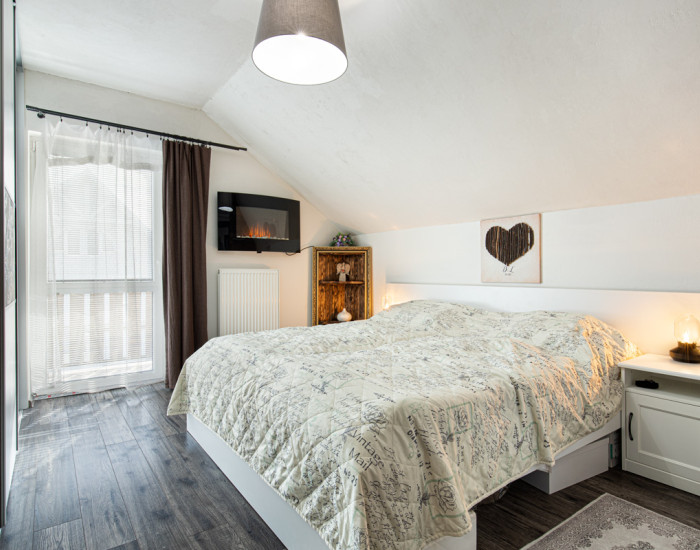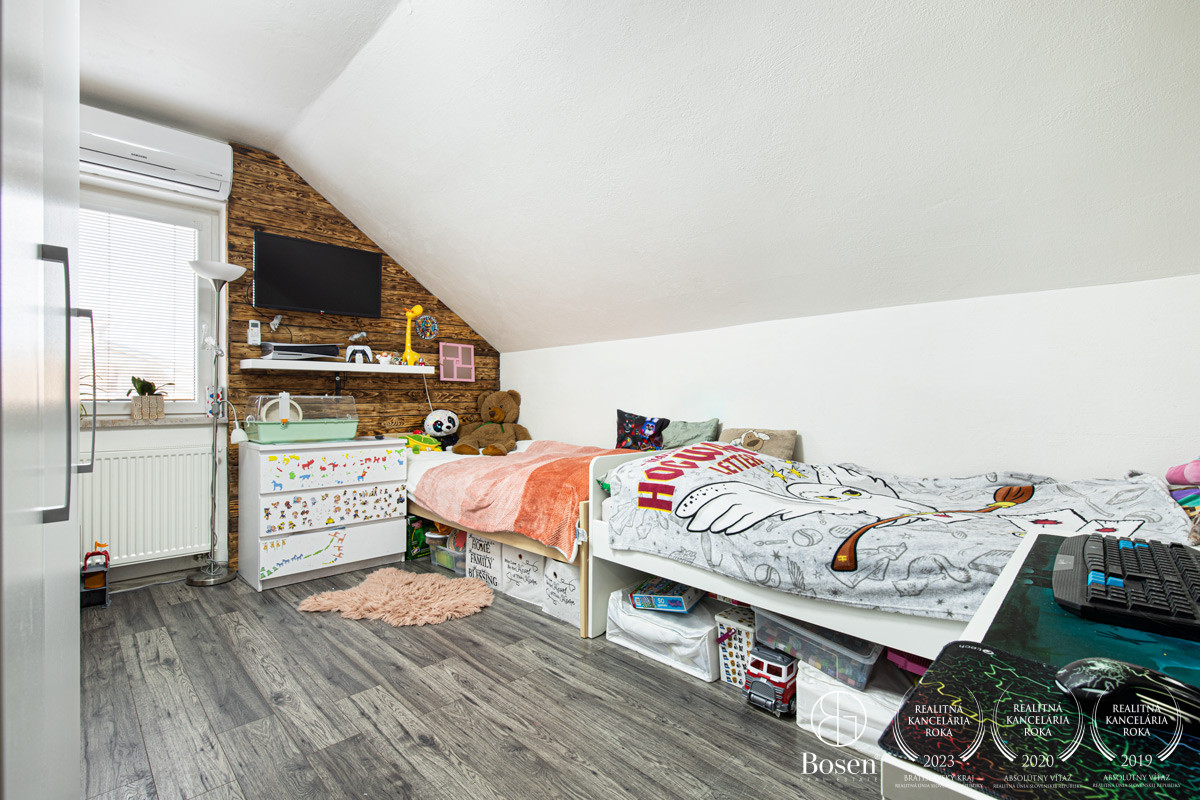 Na poschodí je priestranná chodba, priestranná kúpeľňa veľkosti izby, samostatná toaleta a tri klimatizované spálne. Technická miestnosť disponuje novým kondenzačným plynovým kotlom. Balkón s výmerou 15 m² prepája jednu zo spální s kúpeľňou.
