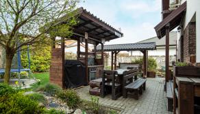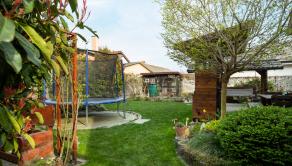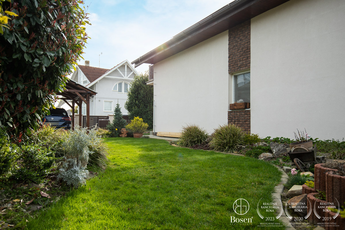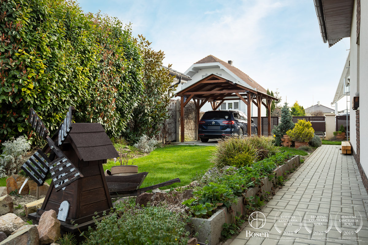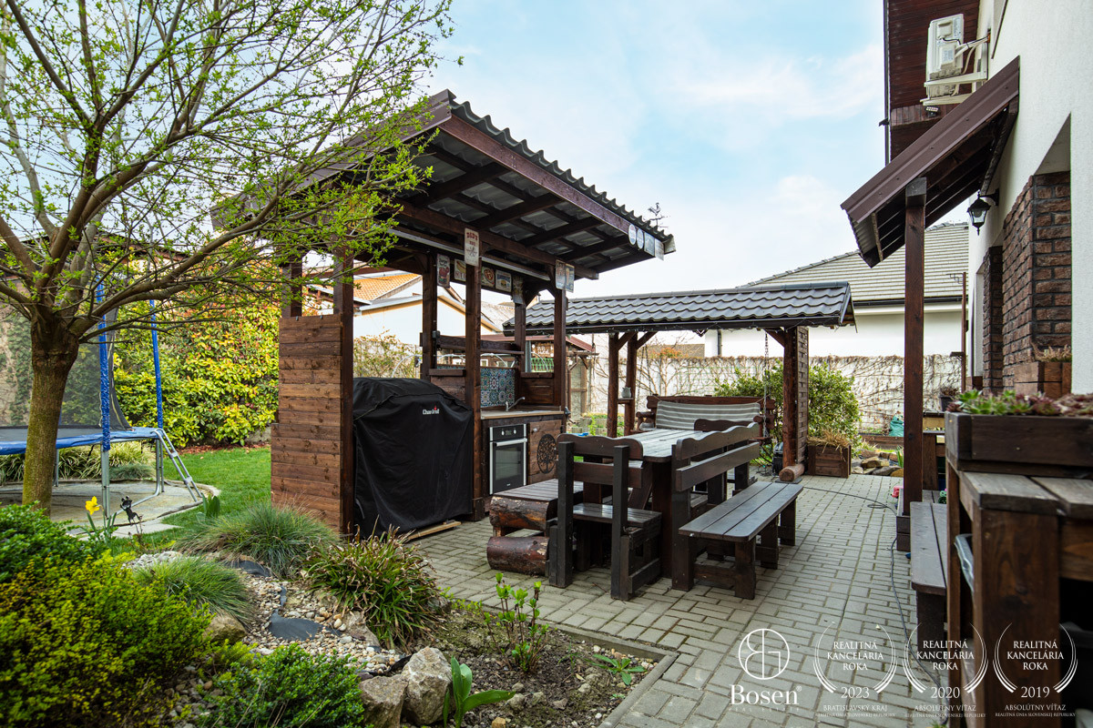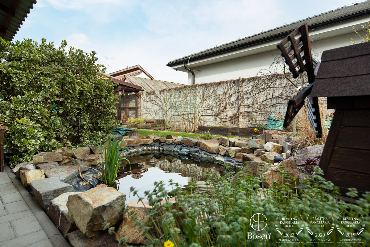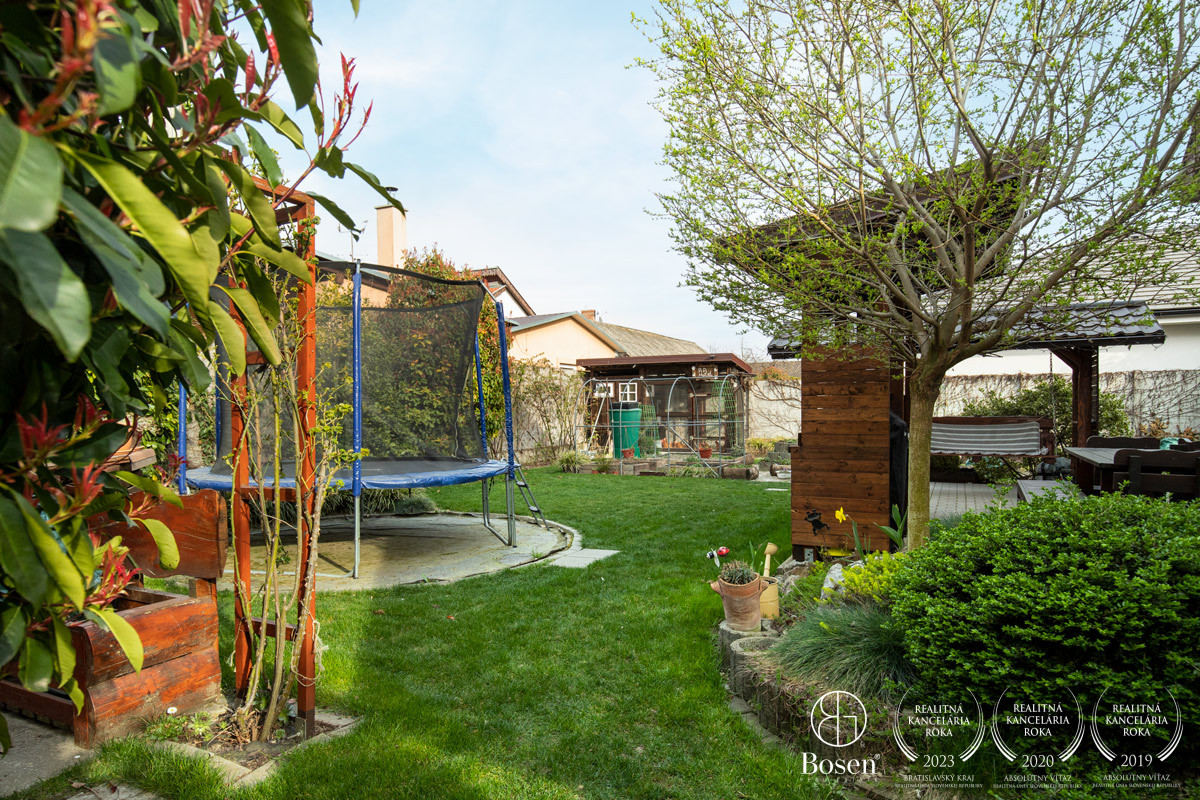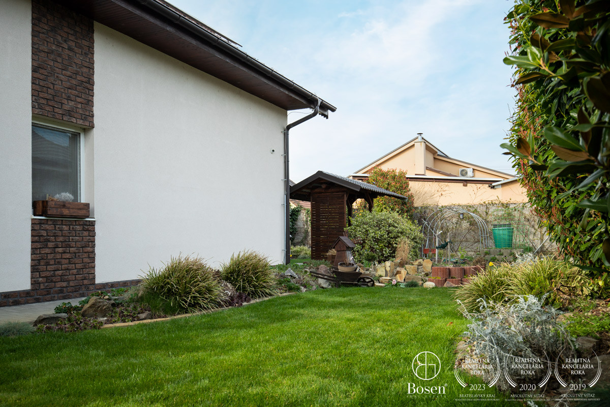 Záhrada je starostlivo upravená a ponúka dokonalý priestor na relax aj aktívne trávenie času. Nájdete tu bazén (366 cm), trampolínu, zastrešenú hojdačku, priestrannú terasu s posedením, vonkajšiu kuchyňu s grilom (doposiaľ nevyužívanú), okrasné dreviny, jazierko a dokonca aj moderný kurín so sliepkami, ktorý zabezpečuje každodenné čerstvé vajíčka.