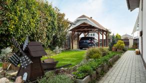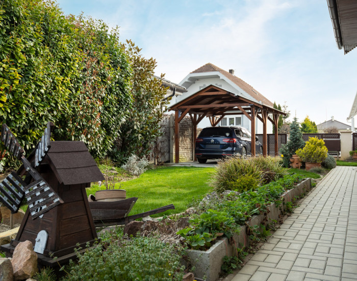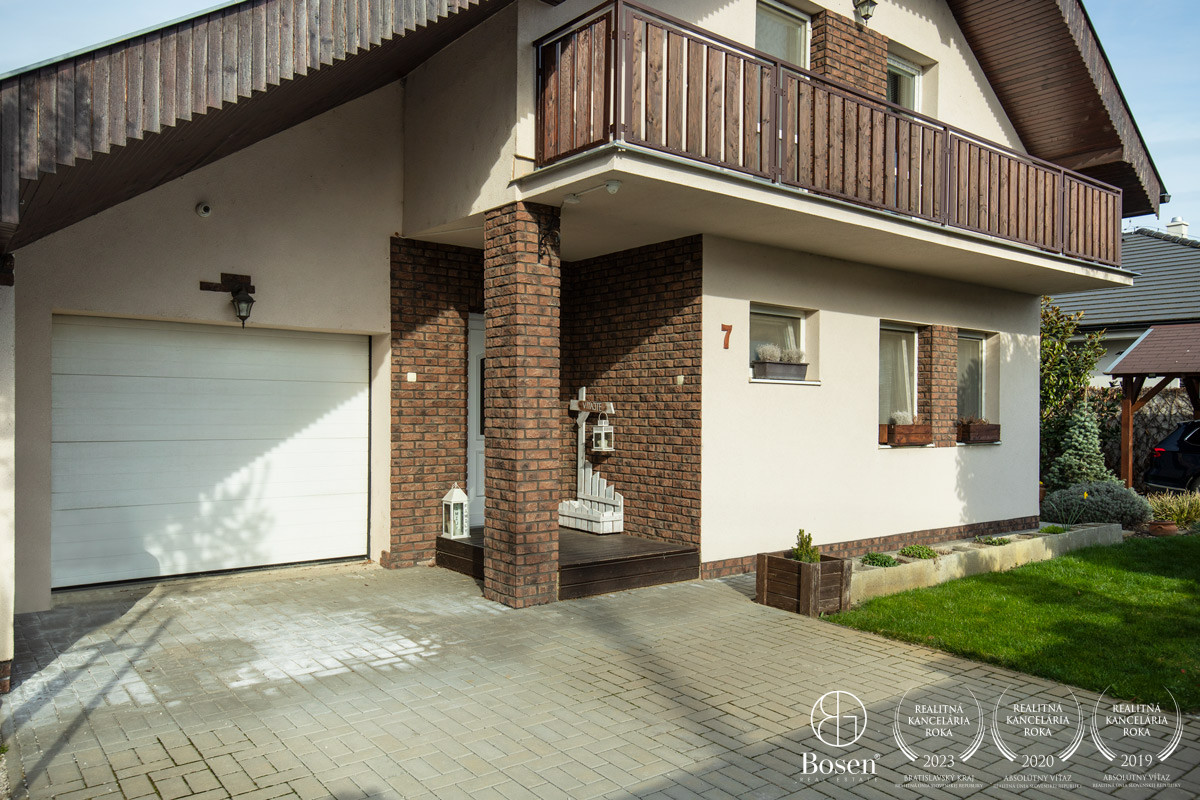 Exteriér ponúka viacero možností parkovania – garáž pre 2 vozidlá (pozdĺžne státie), parkovanie pred garážou, pod prístreškom aj na ulici.