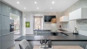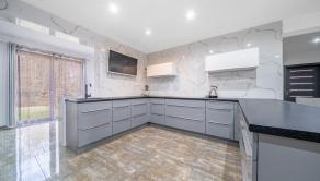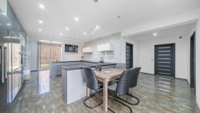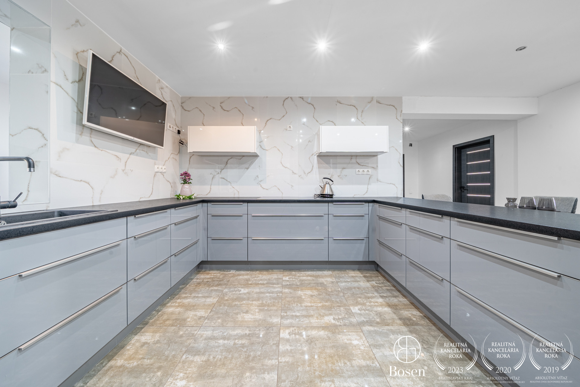 Prízemie domu vás privíta priestrannou vstupnou halou, ktorá plynulo prechádza do luxusnej kuchyne vybavenej prémiovými spotrebičmi značky Bosch. Kuchyňa je navrhnutá ako srdce domova – ideálna pre rodinné stretnutia aj spoločenské večery.