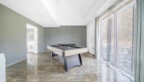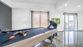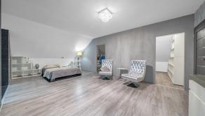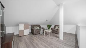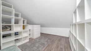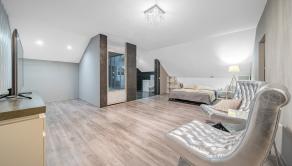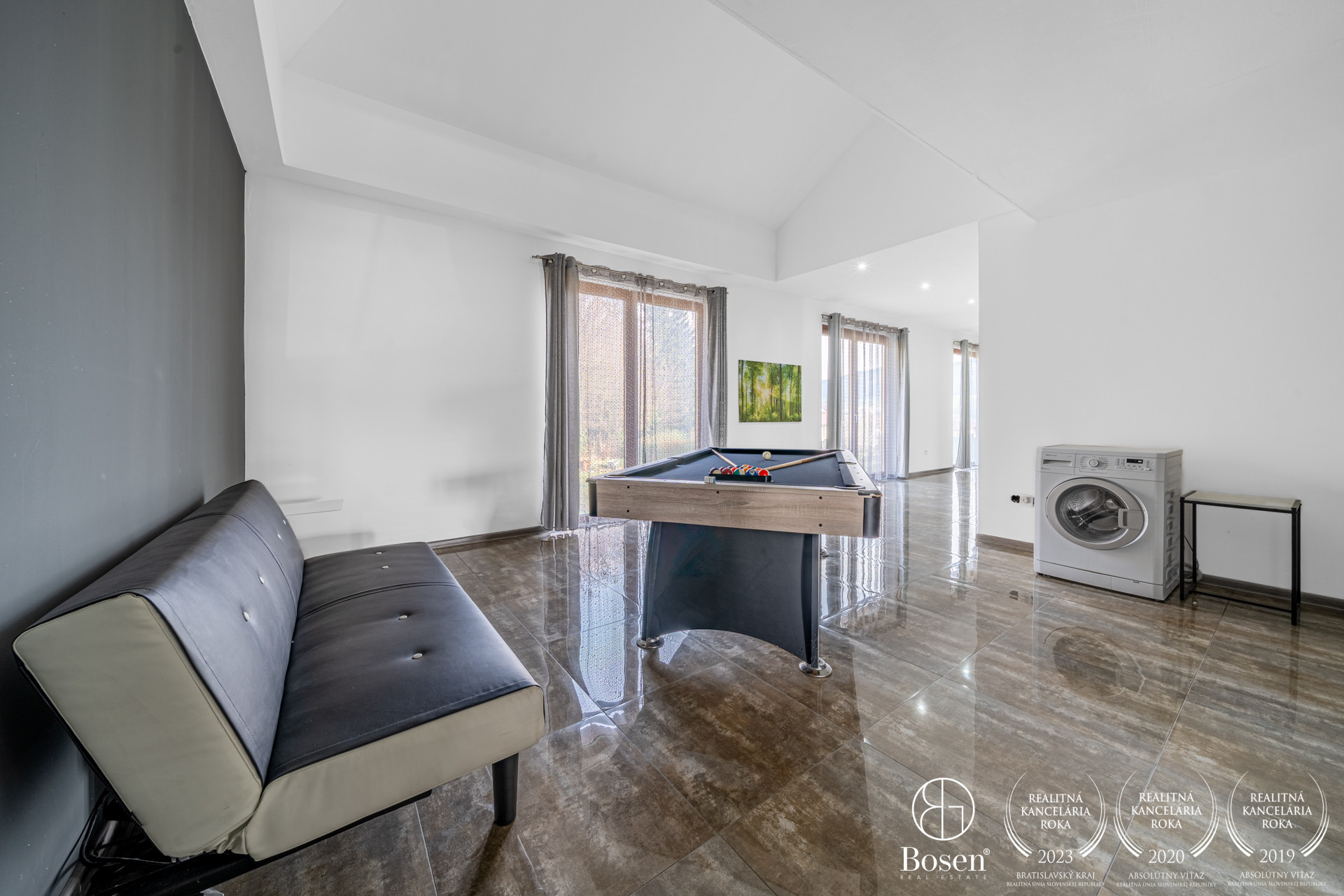 Obývacia izba s jedálenským priestorom očarí krbom, otvoreným stropom a impozantnou galériou, ktorá dodáva interiéru jedinečný architektonický charakter. Súčasťou prízemia je aj spálňa, elegantná kúpeľňa so sprchovým kútom a vaňou, samostatné WC a oddychová miestnosť s prípravou na vytvorenie súkromného wellness – jacuzzi alebo vírivky – s výhľadom do záhrady.
