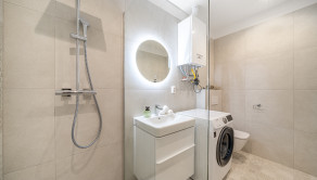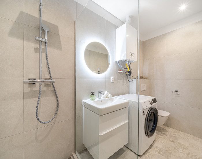 Priestor je prakticky riešený – obývacia časť je vybavená sivou pohovkou, TV skrinkou a úložnou skriňou, pričom spacia časť disponuje rozkladacou posteľou, komodou a pracovným kútom. V kúpeľni sa nachádza práčka, skrinka pod umývadlom, zrkadlo s LED osvetlením a priestranný sprchový kút.