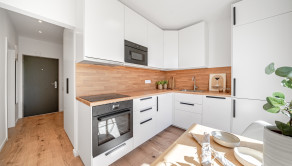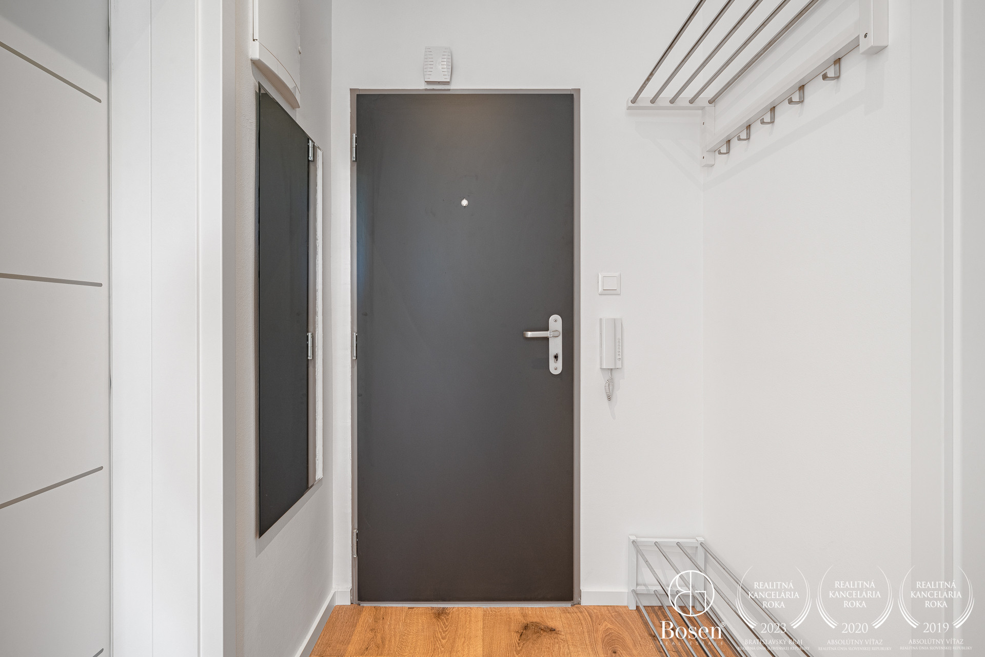 ZARIADENIE: Byt sa prenajíma kompletne zariadený kvalitným nábytkom. Vo vstupnej chodbe sa nachádza vstavaná skriňa, zrkadlo, vešiak a regál na topánky. Kuchyňa je vybavená vstavanou kuchynskou linkou so spotrebičmi, ako sú umývačka riadu, indukčná varná doska, elektrická rúra, chladnička s mrazničkou a mikrovlnná rúra. Súčasťou zariadenia je aj jedálenský stôl so stoličkami.