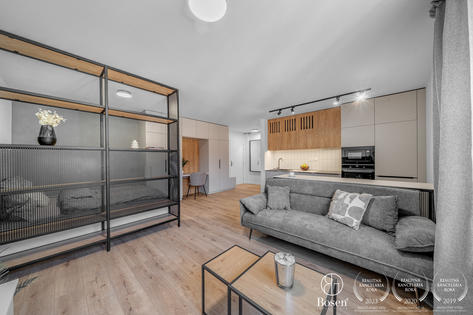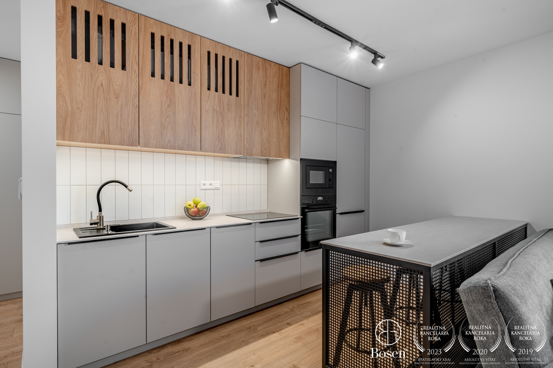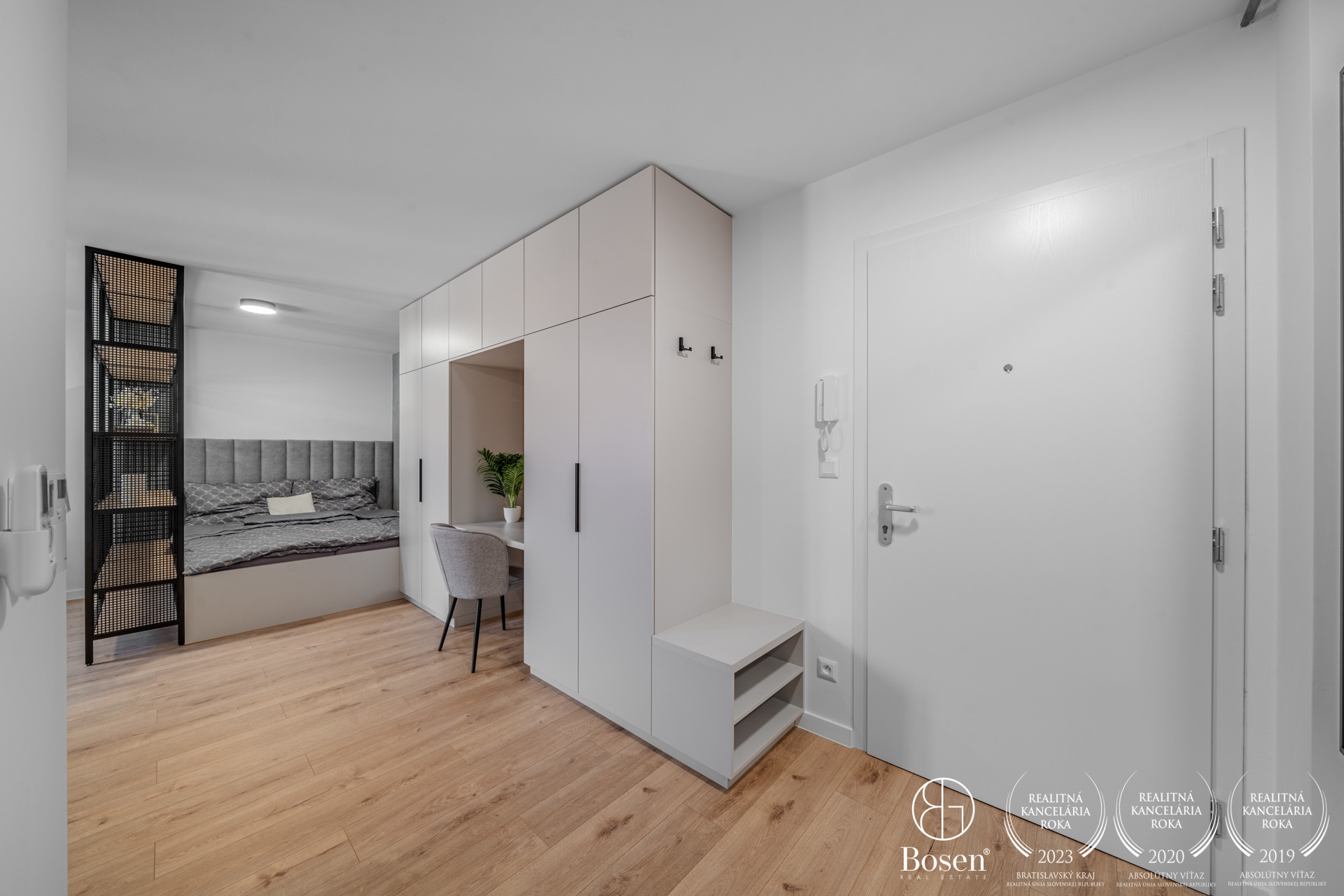BYT: Byt má rozlohu 41,21 m2. Byt sa pýši využitím kvalitných materiálov, premysleným dizajnom a moderným technickým vybavením. Je kompletne zariadený nábytkom vyrobeným na mieru, čo zabezpečuje dostatok úložného priestoru. V byte je práčka, podlahové kúrenie, digestor, indukčná varná doska, umývačka riadu a TV. K bytu prislúcha aj pivnica.