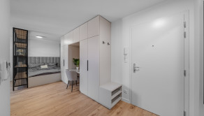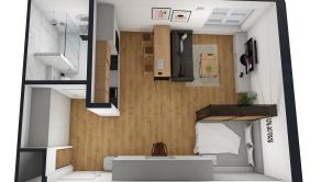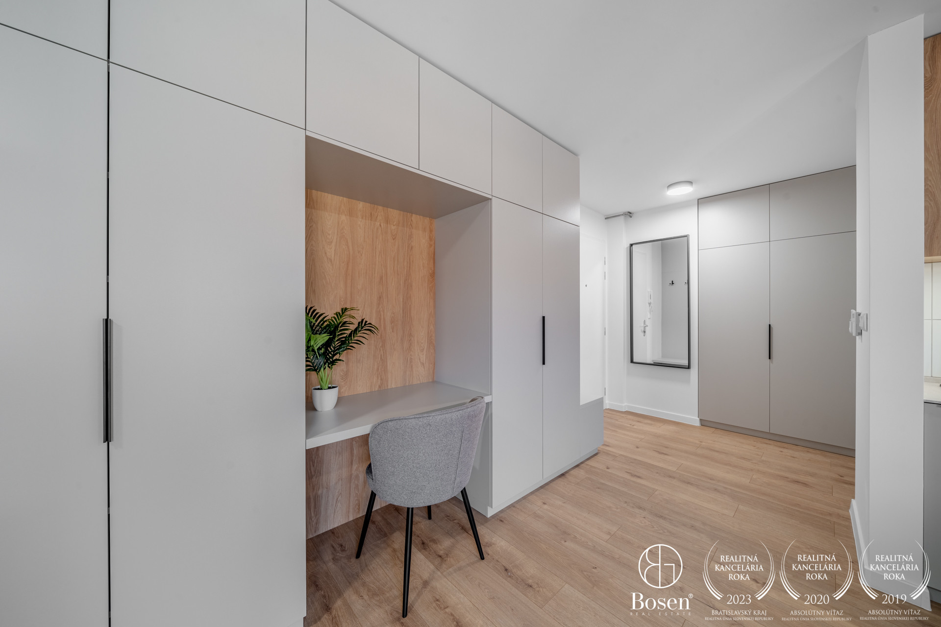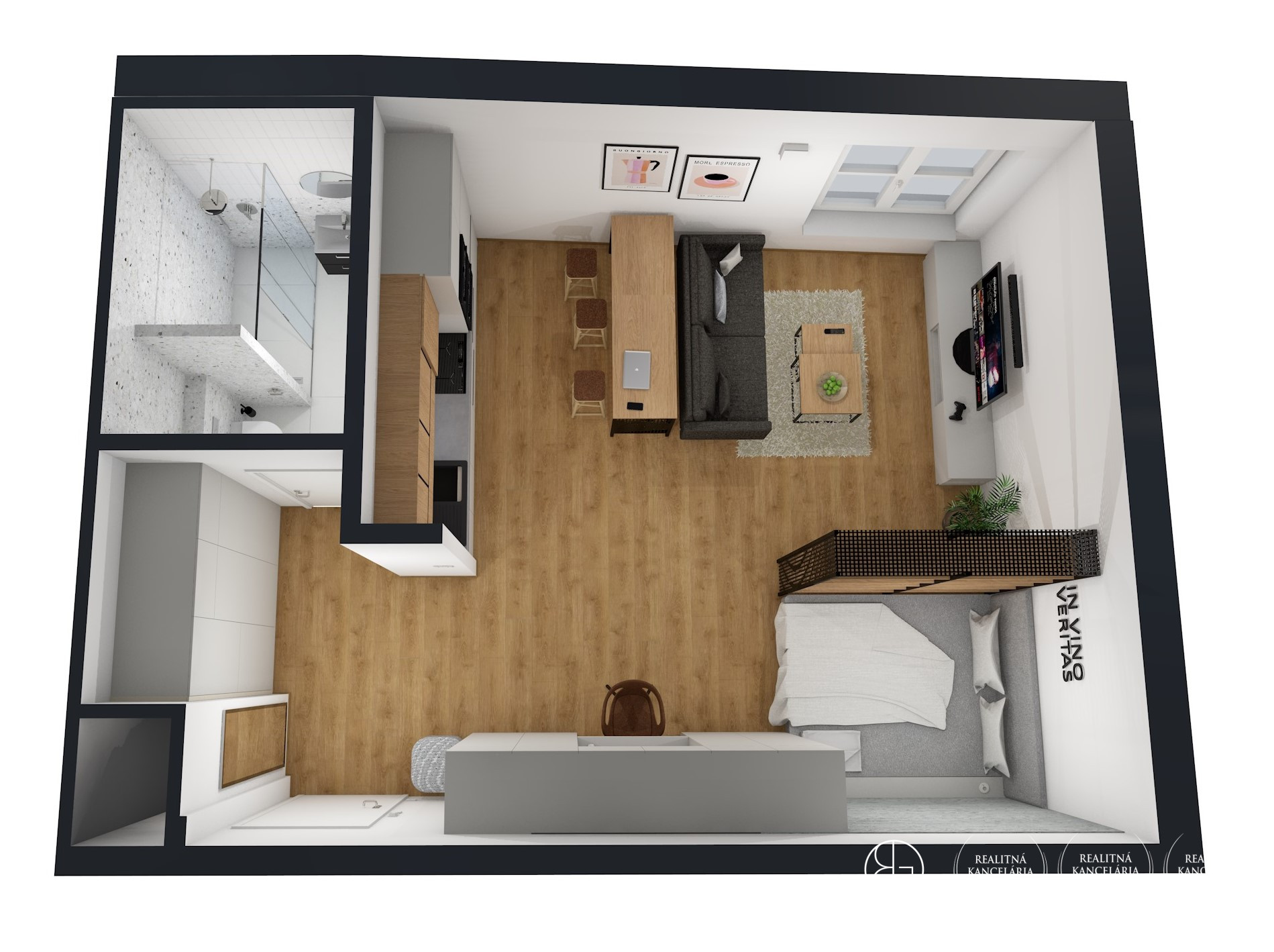 DISPOZÍCIA: Byt pozostáva zo vstupnej chodby, pracovného kúta, nočnej časti ktorá je oddelená od obývačky prepojenej s kuchyňou. V kúpeľni sa nachádza toaleta a sprchový kút.