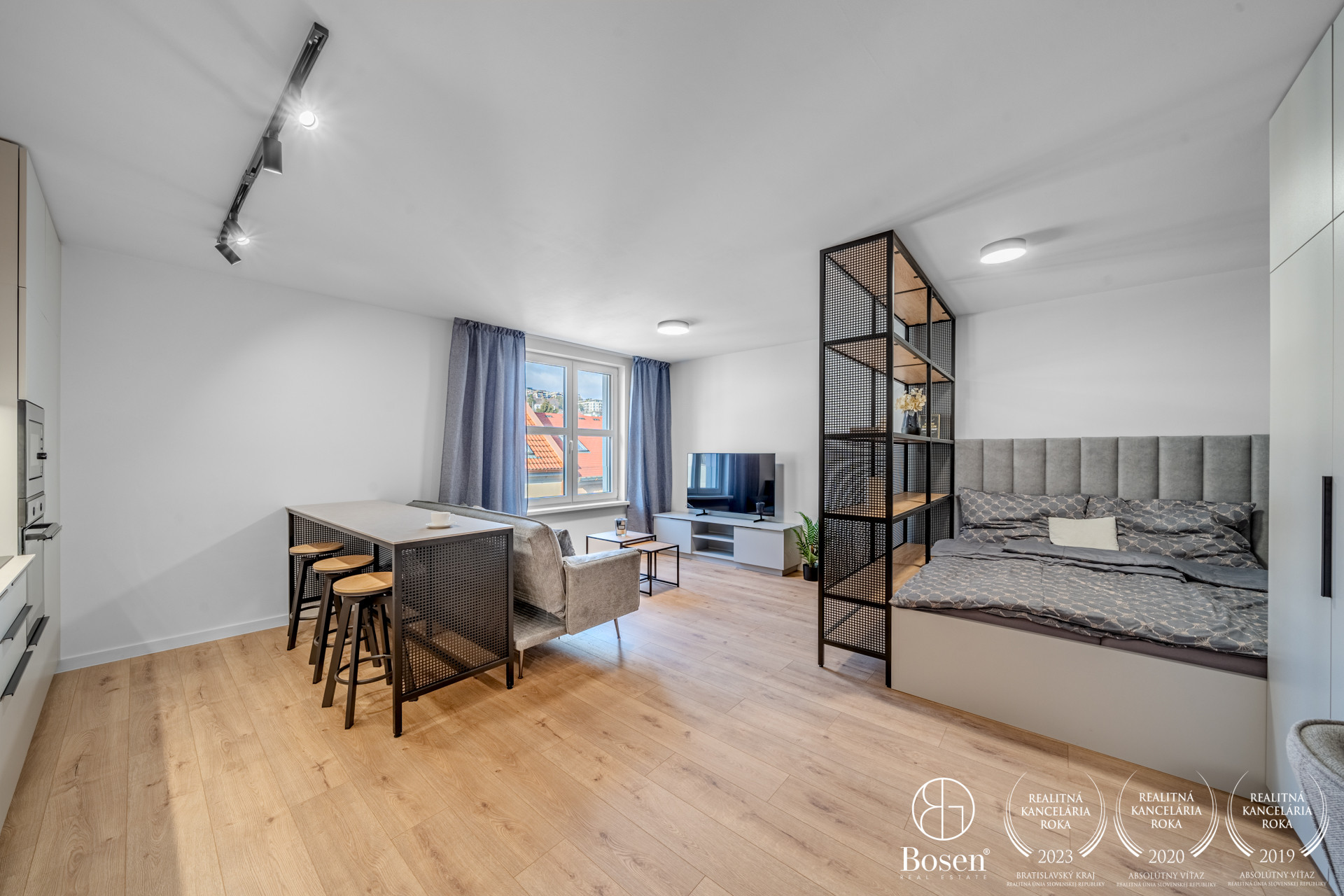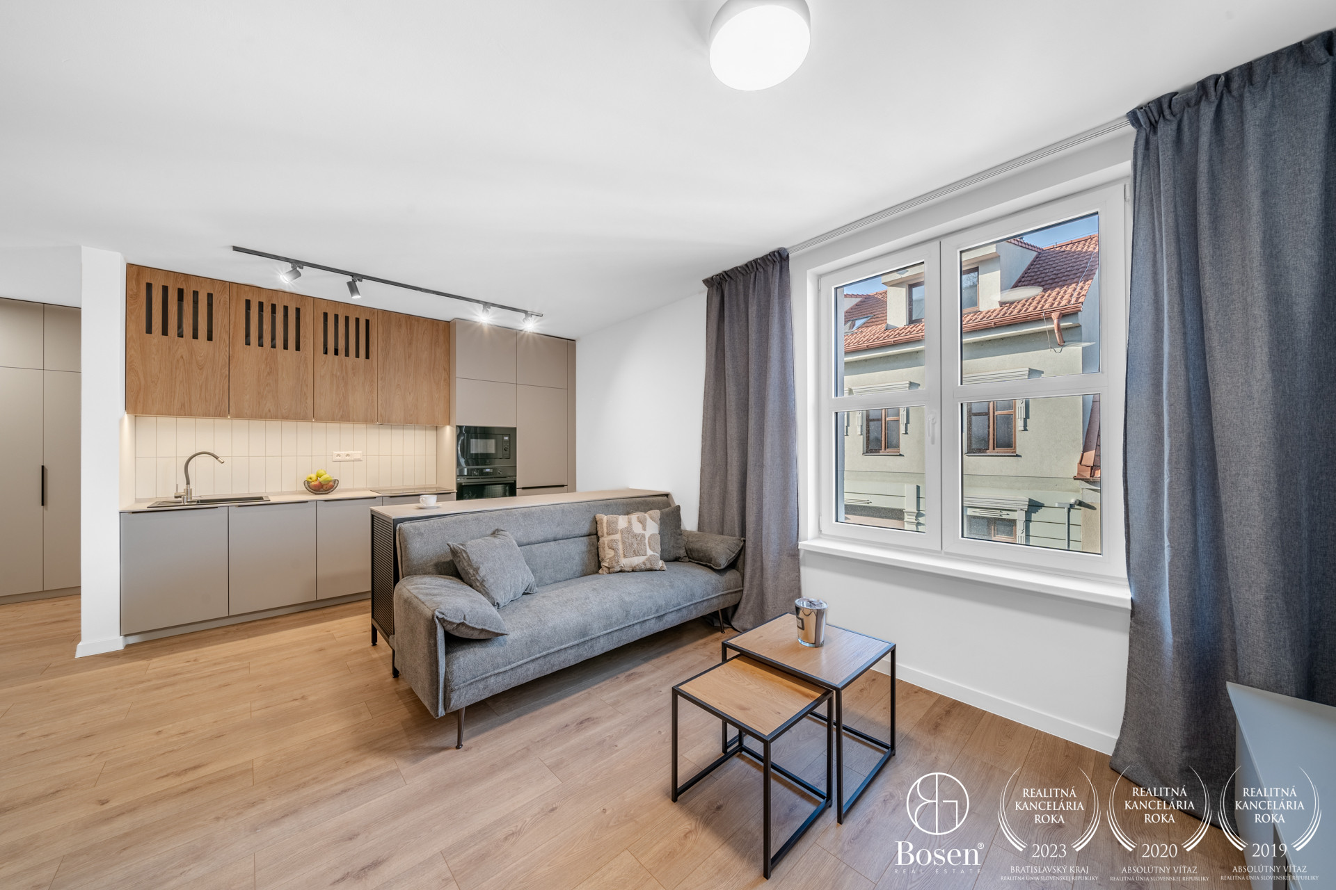Bosen Group Vám ponúka na prenájom moderný a klimatizovaný 1,5 izbový byt v srdci Bratislavy, situovaný v prestížnej lokalite Starého Mesta na Ľadovej ulici. Byt sa nachádza v malej kľudnej bytovke (11 bytov).