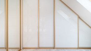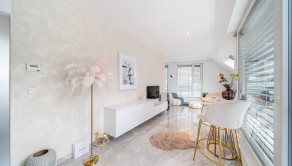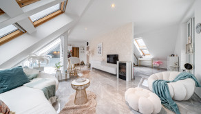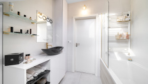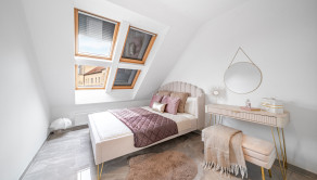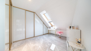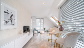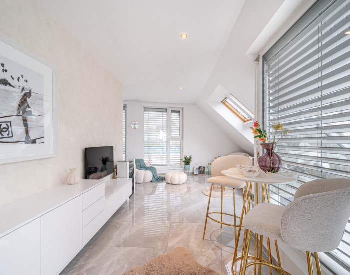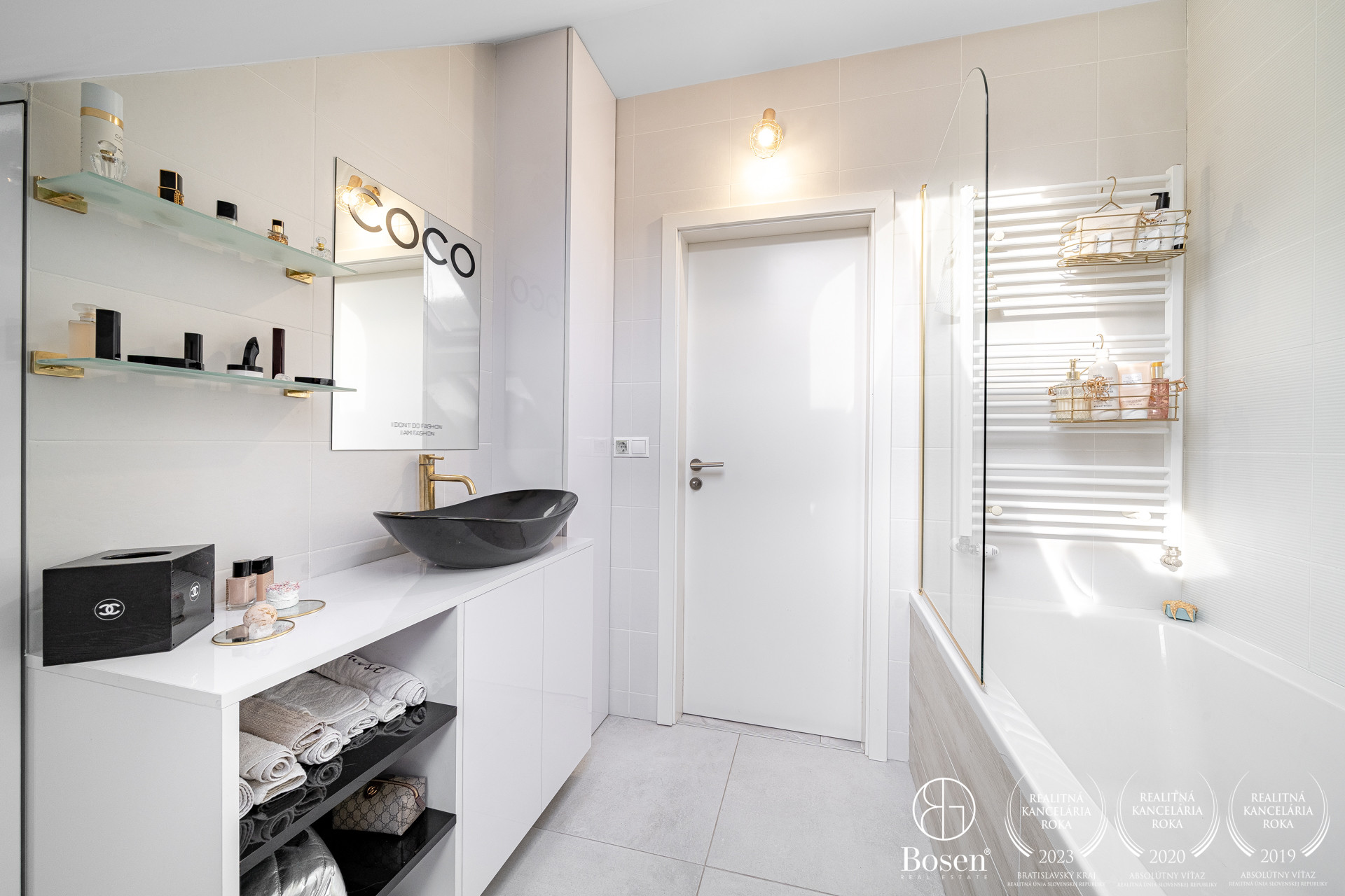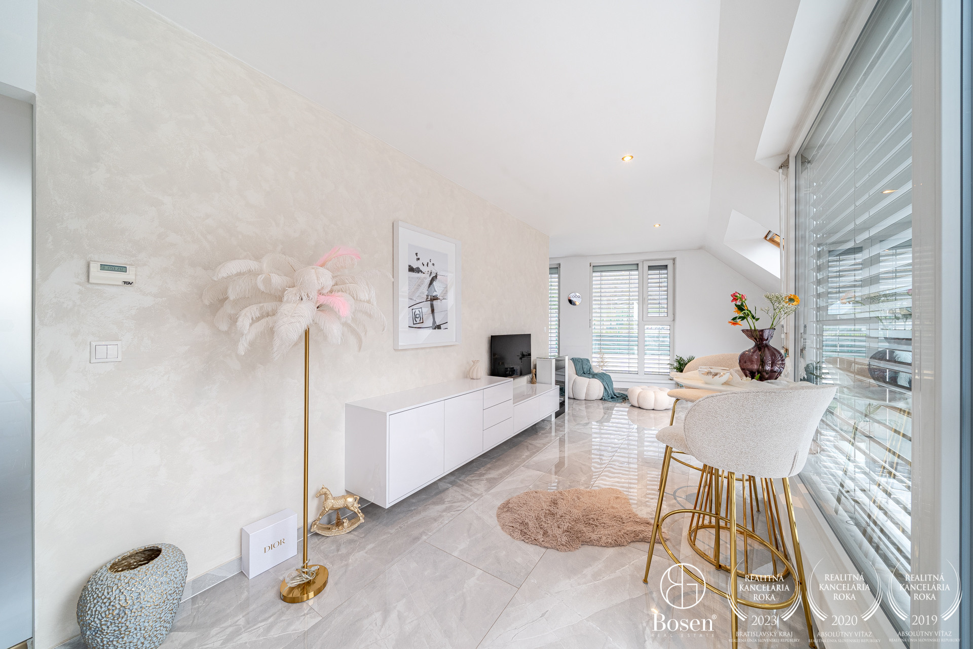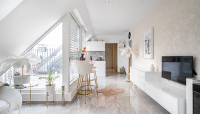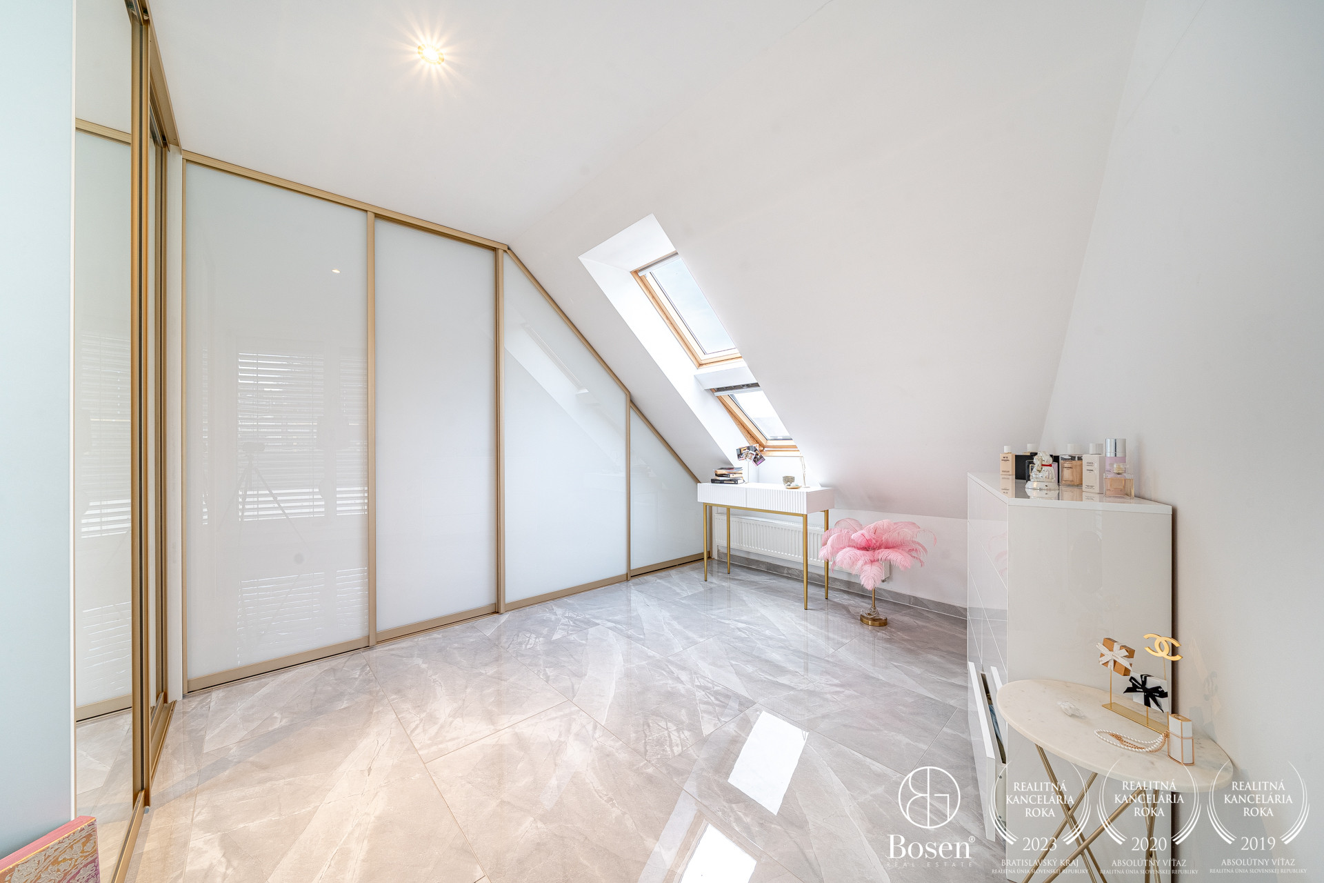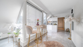 Podlahy sú v glamour štýle a je to talianska dlažba, ktorá pôsobí velmi elegantne a v celom byte sú veľké rolldor skrine v kombinácii so zlatou farbou, čo zdôrazňuje lelegantný štýl. V byte sa nachádza dostatok odkladacieho piestoru.