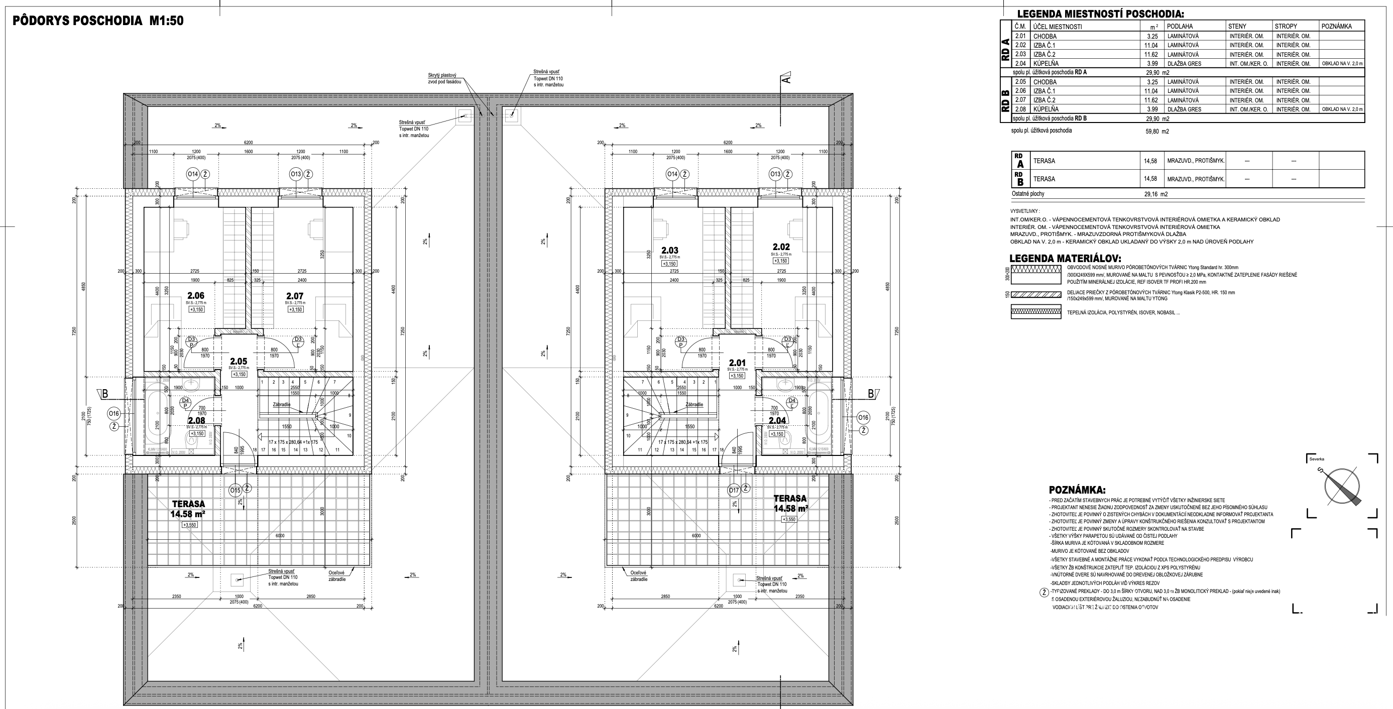 DISPOZÍCIA: Dom pozostáva zo vstupnej chodby, obývačky spojenej s kuchyňou a jedálňou, spálňa s výstupom na terasu a vlastnou kúpelňou. Zo vstupnej chodby sa dostaneme do garáže z ktorej je prístup do technickej miestnosti. Na druhom poschodí sa nachádzajú dve samostatné izby, kúpeľňa spojená s WC a terasa o výmere 15m2.