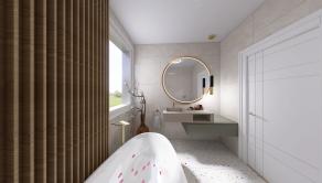 vstupná chodba so samostatným WC, obývacia izba s krbom, jedáleň, kuchyňa s praktickou špajzou, kúpeľňa s WC, spálňa so šatníkom a kúpeľňou s WC, 3 x izba, technická miestnosť.