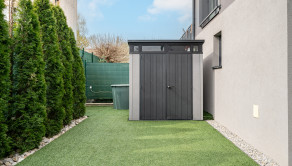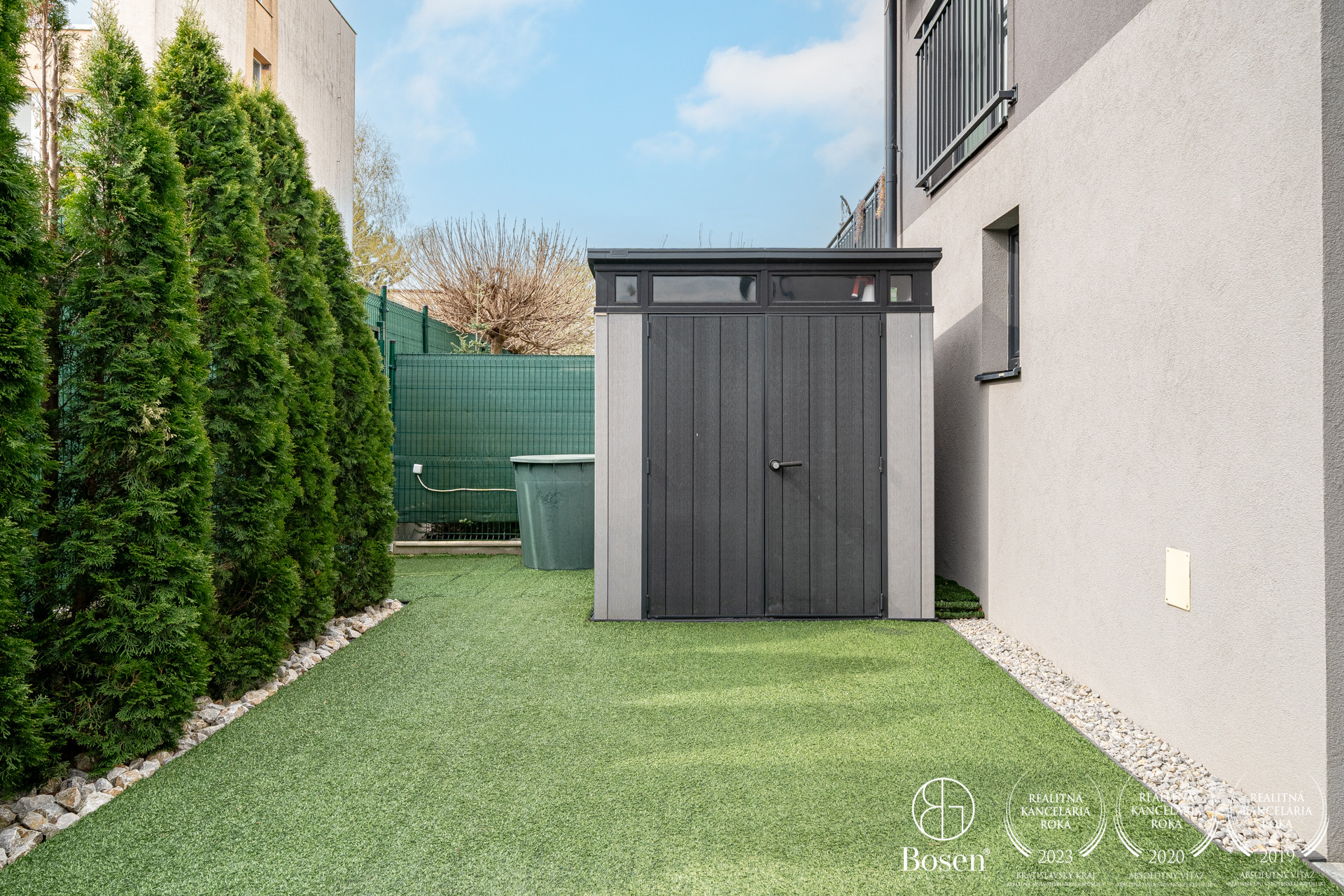PREDZÁHRADKA: veľkým benefitom je vlastná predzáhradka, ktorá je oplotená a vysadená je aj zeleň, ktorá poskytuje súkromie od okolia bytového domu aj od susedov. Pozemok o výmere 80m2 je vo výlučnom vlastníctve. Terasa je vydláždená a tienenie zabezpečuje namontovaná kazetová markíza s elektrickým pohonom. Na pozemku zostáva aj záhradný domček a je tu vyvedený prívod vody.