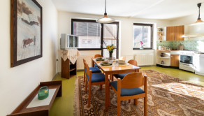 Prízemie: vstupná hala, kuchyňa s jedálňou a balkónom, obývačka so spálňou (možnosť oddelenia), WC, špajza, lodžia s výhľadom na záhradu.