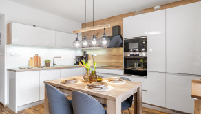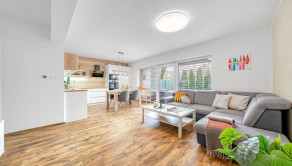BYT: výmera bytu je 78m2, do bytu je úplne bezbariérový prístup. Byt pozostáva z chodby, dvoch spální, kuchyne prepojenej s obývačkou odkiaľ je vstup na vlastnú predzáhradku, kúpeľne a samostatného wc. Byt je zariadený nábytkom na mieru, osadené sú bezpečnostné vstupné dvere, na oknách sú namontované elektrické žalúzie a má vlastné elektrické vykurovanie (podlahové) s termostatom v každej izbe zvlášť. Príjemnú atmosféru navodzujú aj benátske stierky. Čisté línie a neutrálne farby Vám umožnia dotvoriť domov podľa seba a bez ďaľšej veľkej investície.
