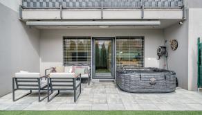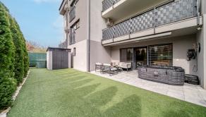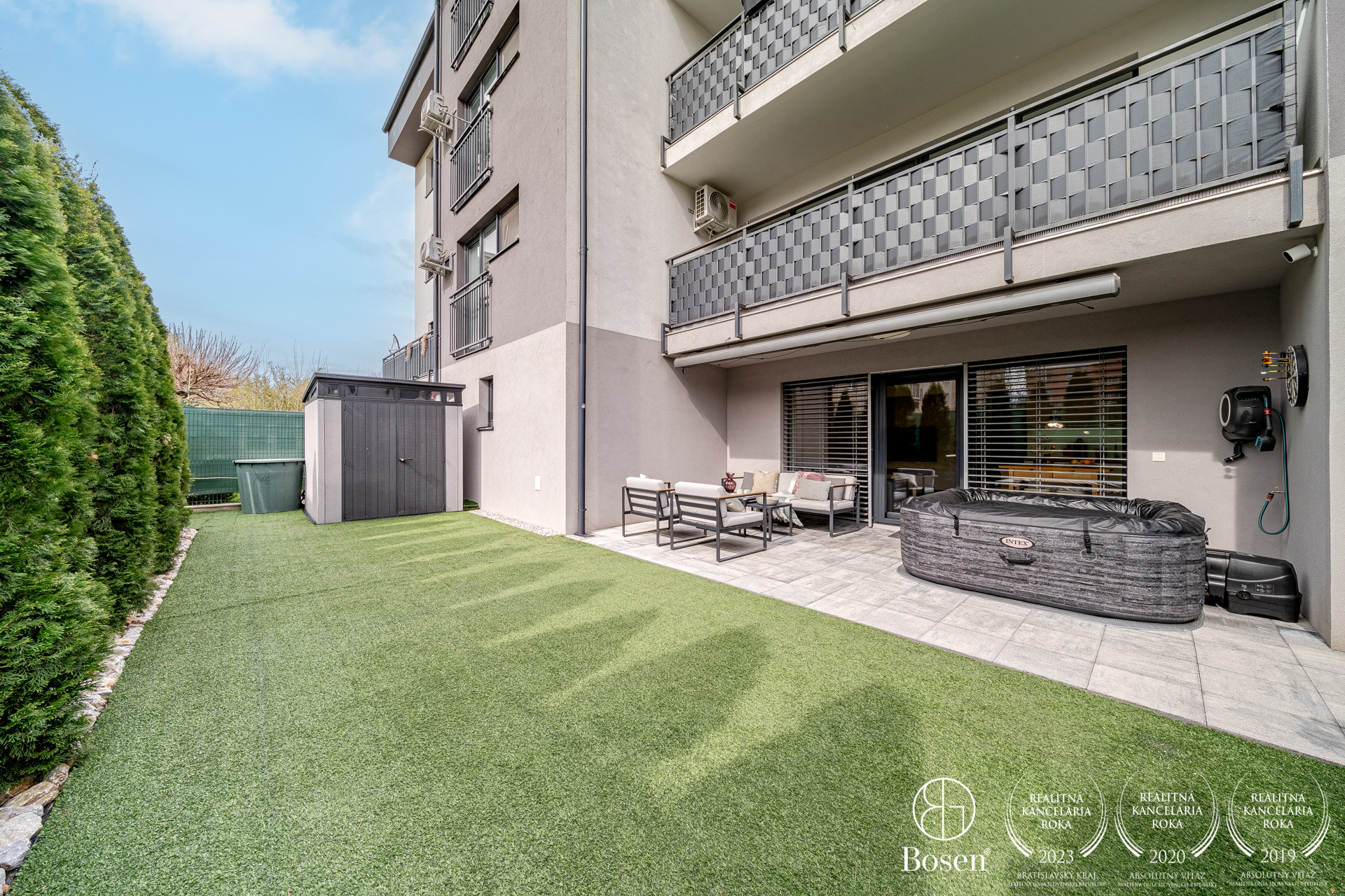 PREDZÁHRADKA: veľkým benefitom je vlastná predzáhradka, ktorá je oplotená a vysadená je aj zeleň, ktorá poskytuje súkromie od okolia bytového domu aj od susedov. Pozemok o výmere 80m2 je vo výlučnom vlastníctve. Terasa je vydláždená a tienenie zabezpečuje namontovaná kazetová markíza s elektrickým pohonom. Na pozemku zostáva aj záhradný domček a je tu vyvedený prívod vody.