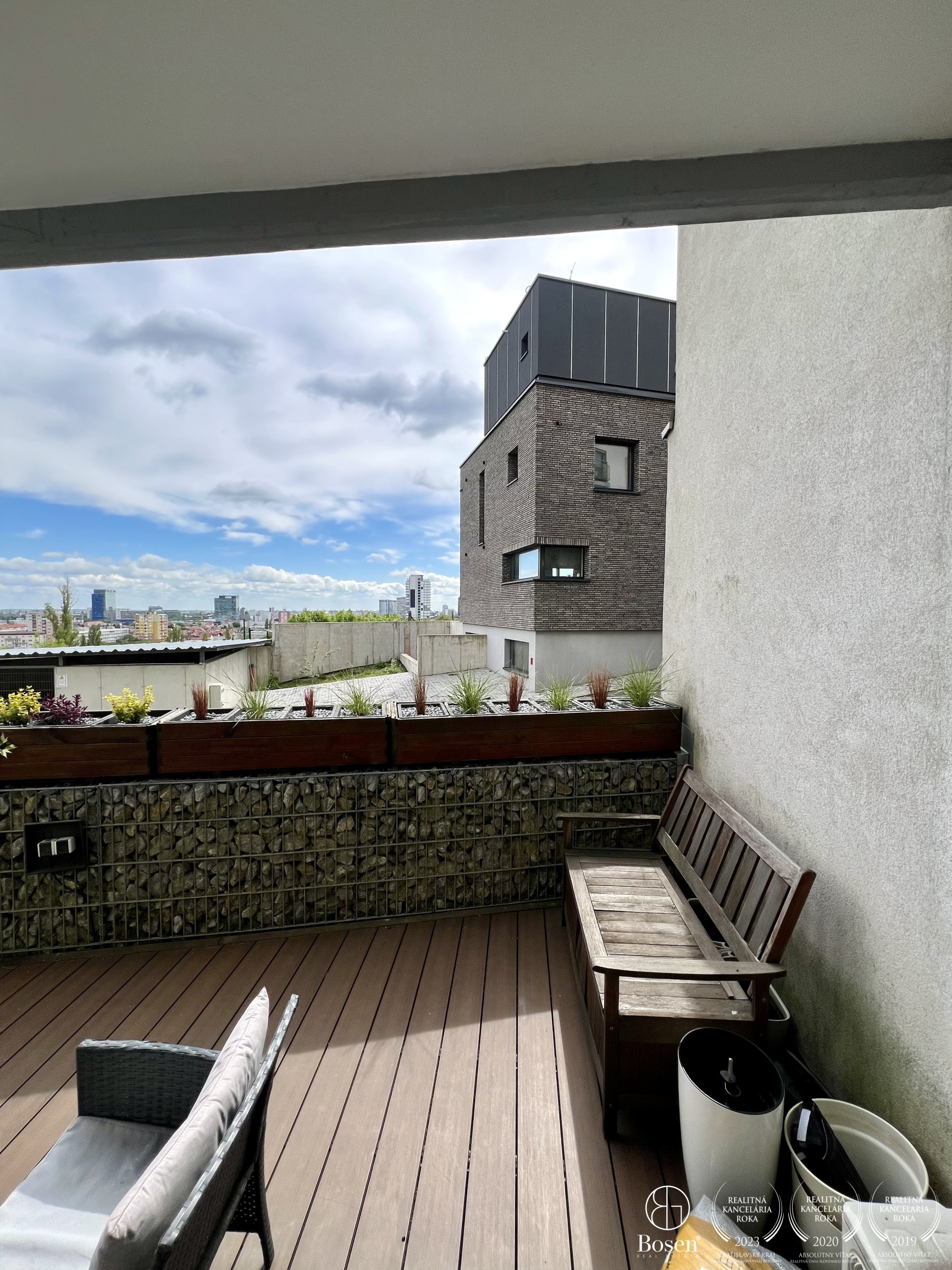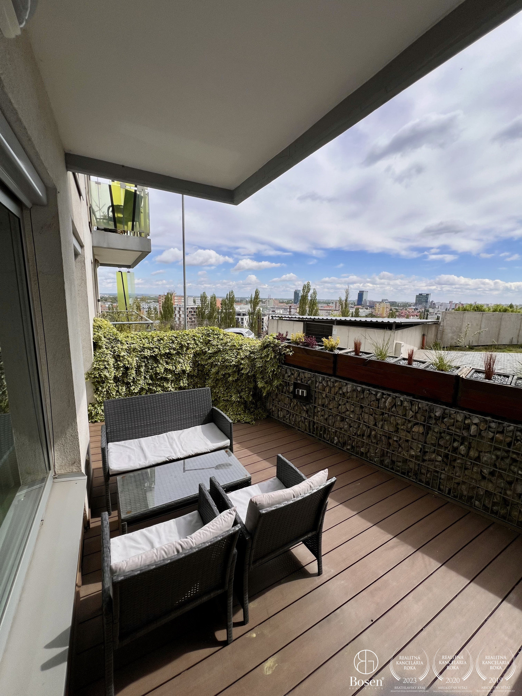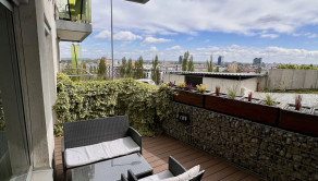 Najväčšou dominantou bytu je priestranná terasa s výmerou až približne 15 m², ktorá výrazne presahuje bežný štandard podobných bytov. Z terasy sa otvára panoramatický výhľad na celú Bratislavu, ktorý vytvára jedinečnú atmosféru počas dňa aj večer. Je to ideálne miesto na rannú kávu, oddych po práci alebo príjemné večerné posedenie.