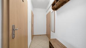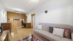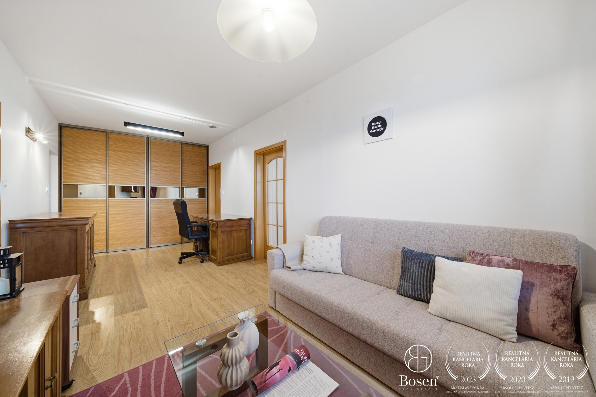 ZARIADENIE: Byt sa prenajíma zariadený kvalitným nábytkom. Vo vstupnej chodbe sa nachádza botník a vešiak. Obývacia izba ponúka rozkladaciu sedačku, konferenčný stolík, TV a TV zostavu. V pracovnej časti sa nachádza vstavaná skriňa po celej dĺžke steny, pracovný stôl so stoličkou a komoda. Kuchyňa je vybavená kuchynskou linkou so vstavanými spotrebičmi – elektrickou rúrou, plynovou varnou doskou, digestorom, mikrovlnnou rúrou, umývačkou riadu a chladničkou s mrazničkou. Súčasťou je aj jedálenský stôl s rohovým sedením.Spálňa disponuje manželskou posteľou, nočnými stolíkmi, vstavanou skriňou a knižnicou. V kúpeľni sa nachádza vaňa, práčka, umývadlo so skrinkou a zrkadlo. Ďalšia izba je čiastočne zariadená vitrínou, pričom zvyšok si nájomca môže zariadiť podľa vlastných preferencií.