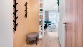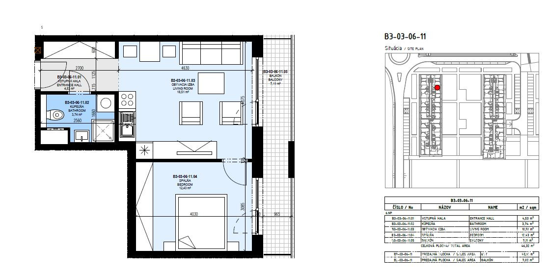 BYT: Byt má celkovú výmeru 46,32 m², z toho loggia tvorí 7,11 m². Orientovaný je do pokojného zeleného vnútrobloku, čo zabezpečuje tiché bývanie s dostatkom súkromia. Nachádza sa na 5. nadzemnom podlaží zo 7 a je vybavený klimatizáciou.