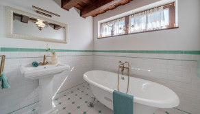 1 NP: zádverie, kúpeľňa s voľne stojacou vaňou a toaletou, priestranná obývacia izba s krbom prepojená s kuchyňou a s výstupom na terasu.