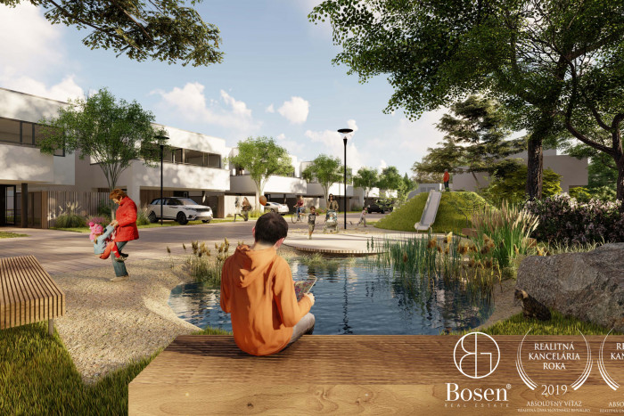 V bielej omietke dáva ulici výraz čistoty a poriadku. Život v exteriéri je príjemným aj na ulici, oživenej parkom s vodnou plochou a inšpirujúcim prostredím pre hry detí aj susedské spolužitie. Intimita života v záhradách jednotlivých domov je zase obohatená o pobytové terasy na poschodí, odkiaľ je možné pozorovať širšiu prírodnú panorámu nad Záhorskou Bystricou.